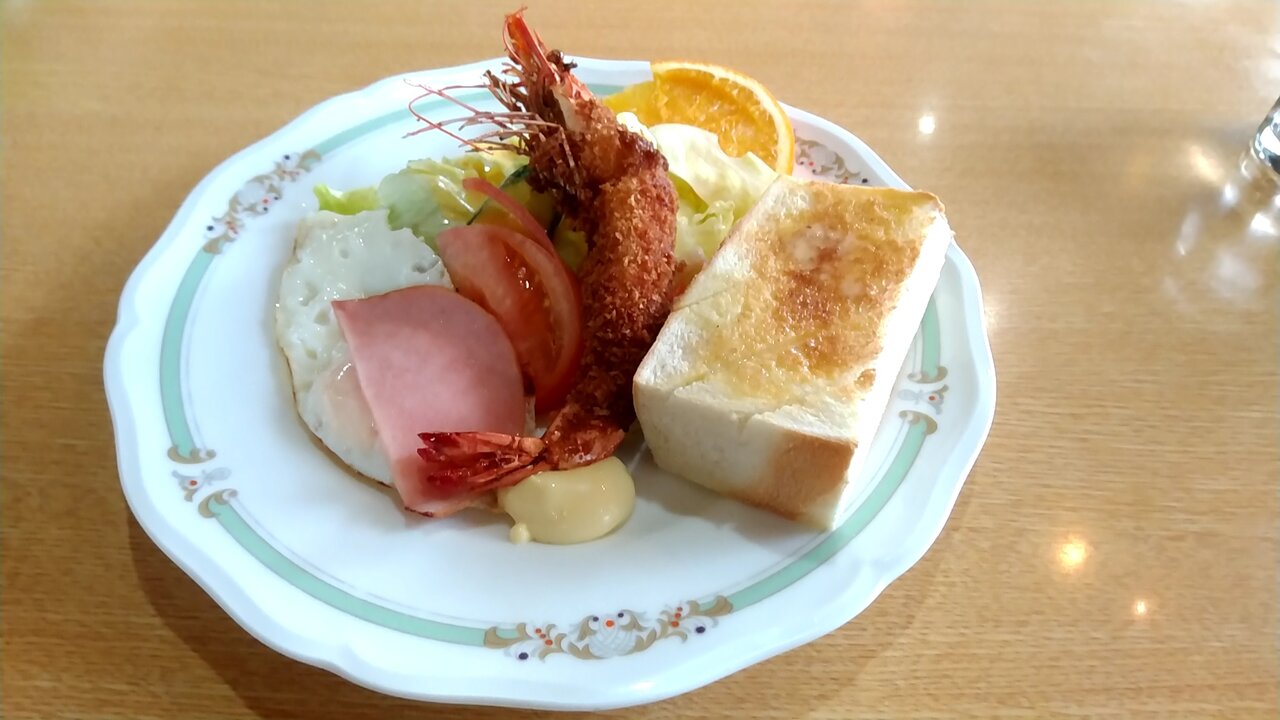 大きめの有頭エビフライがインパクト大で、ハムエッグ、マカロニサラダ、レタス、トースト半分、オレンジがワンプレートで、ホットコーヒーが付いてかなり豪華な内容です。